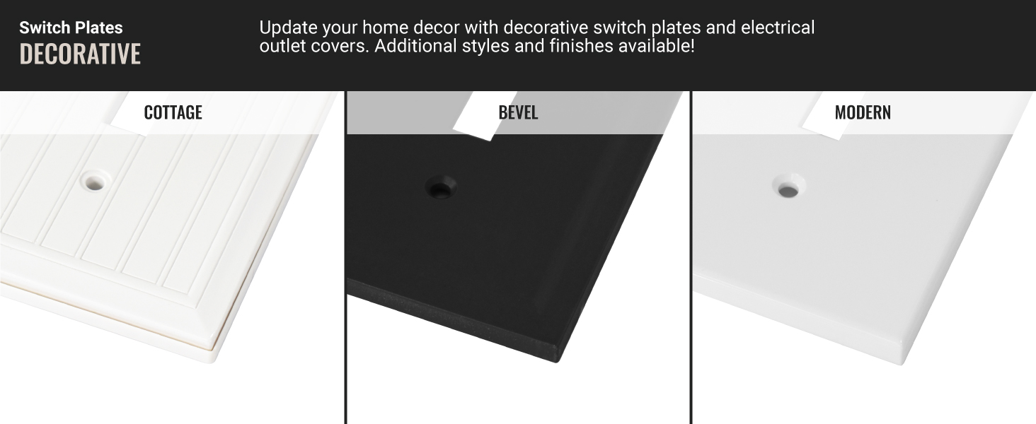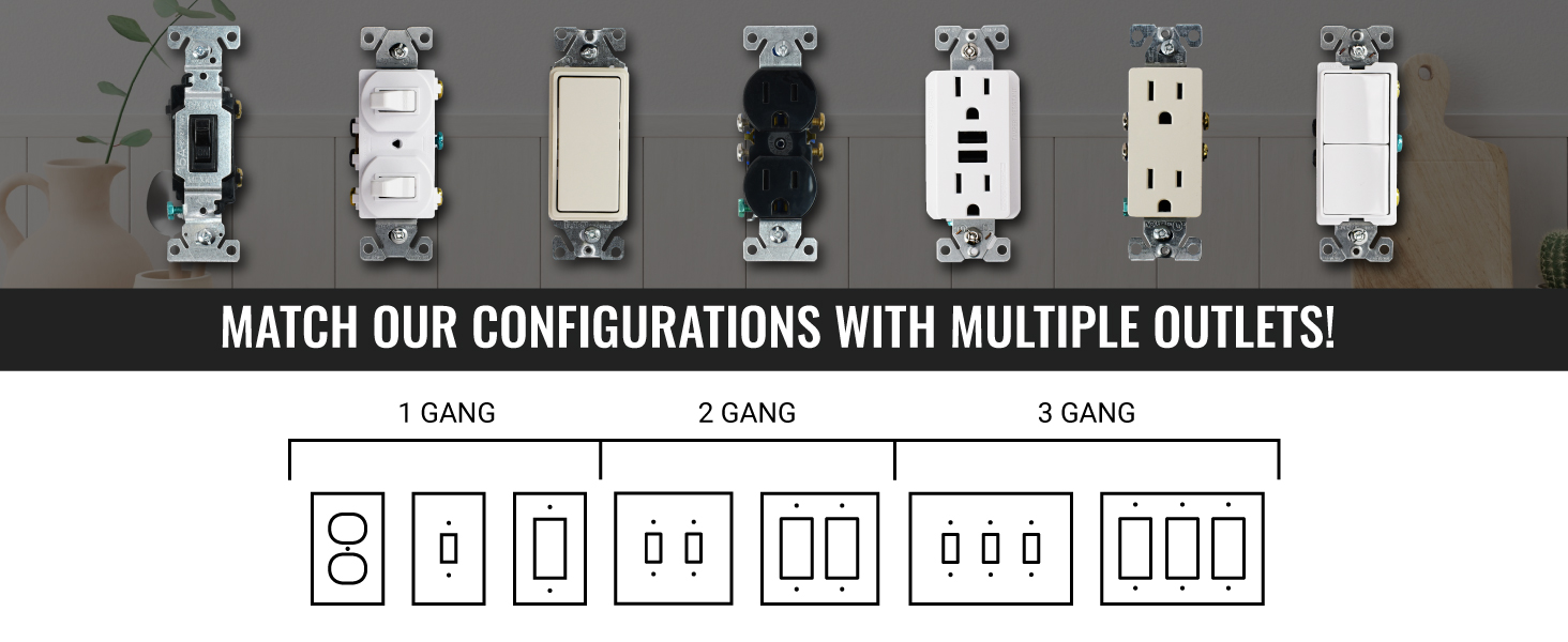 MULTIPLE CONFIGURATIONS: Choose from various designs including single duplex, toggle and decorator, double and triple rocker GFCI and toggle switches. Finishes available are white polished, white satin, and matte black.